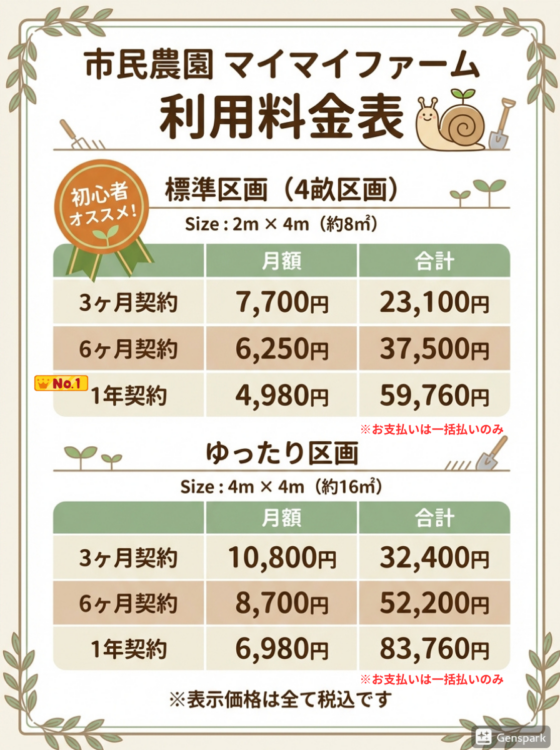市民農園マイマイファームの利用料金には、区画の利用だけでなく、 畑づくりを進めていくためのサポートも含まれています。