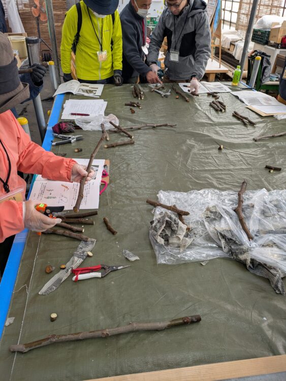 受講生の皆さん、それぞれ5〜10本ほどの穂木を作成しました。