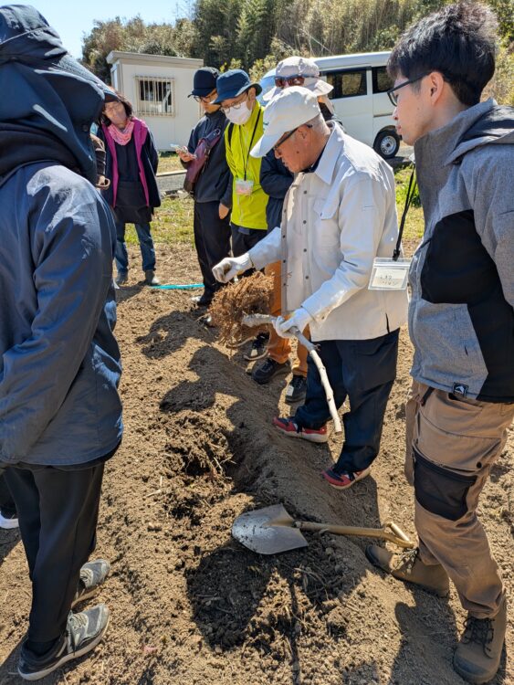 今回も、実際の畑でプロの管理を見ながら、受講生の皆さんと一緒に一本一本確認しながら作業を進めました。