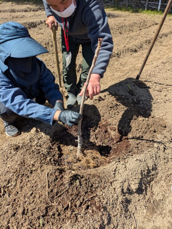 植え穴をしっかり掘り、牛糞堆肥を入れていきます。